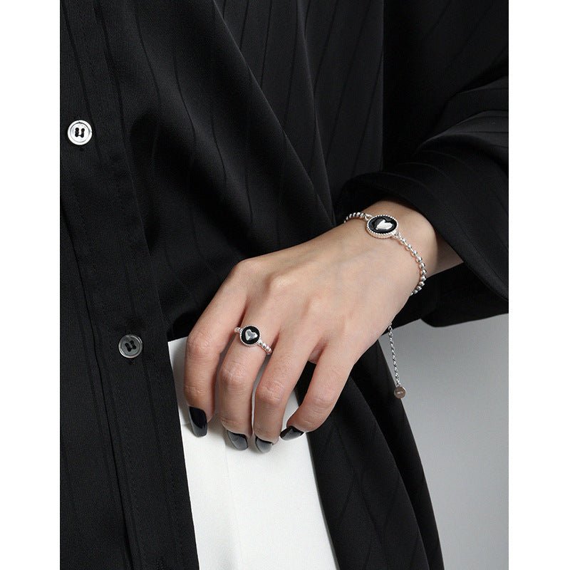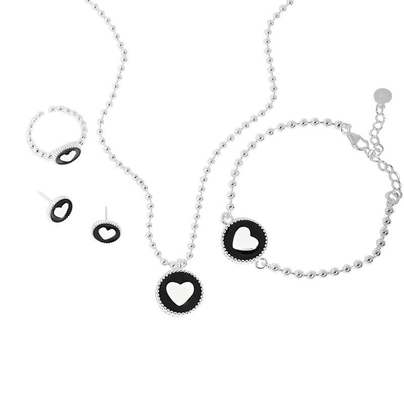 Women Heart Black Epoxy 925 Sterling Silver Necklace Ring Earrings Bracelet Jewelry Set